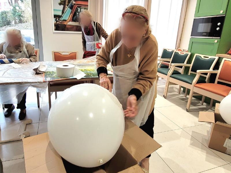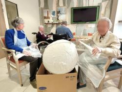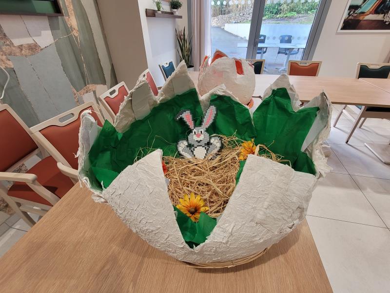 Afin que nos agents de service hospitalier puisse servir les œufs en chocolats à l'ensemble de nos résidents de manière ludique le dimanche de Pâques, notre animateur et quelques-uns de nos séniors ont fabriqué durant la semaine plusieurs récipients en forme d'œufs géants permettant de stocker tous les chocolats qui leur seront offert !