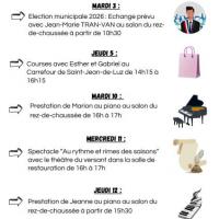 Publiée le 01/01/2026Pour fêter le passage à la nouvelle année, notre résidence a accueilli un duo d'artistes : Mlle Anne PAUMIER, notre ancienne animatrice reconvertie dans le chant, et Mr Daniel SUBRECHICHOT, pianiste à l'Hôtel du Palais de Biarritz. Lire la suite