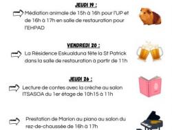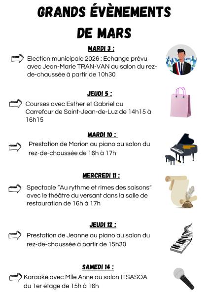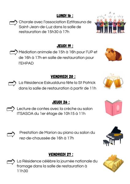 Résidence Eskualduna > Actualités > Programme des grands évènements de Mars Programme des grands évènements de Mars Publiée le 03/03/2026 Veuillez trouver ci-joint le programme des grosses animations du mois de Mars qui se dérouleront au sein de notre résidence.